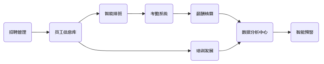 酒店一站式HR数字化系统结构图,展示招聘、员工信息、排班、考勤、薪酬与培训模块的协同与数据流动,分析中心与智能预警联动。
