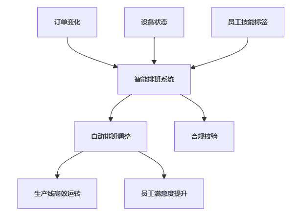 订单变化、设备状态和员工技能标签数据输入智能排班系统,实现自动排班调整、合规校验和生产效率提升。