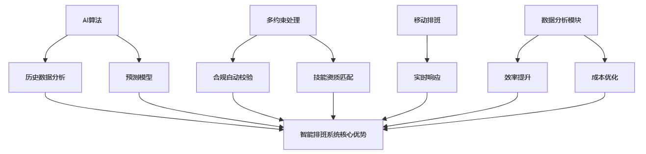AI算法、约束处理、移动排班和数据分析共同构成智能排班系统的核心技术优势,实现合规、效率和成本优化。