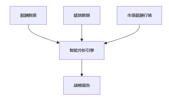 智能薪酬管理软件数据分析流程结构图,展示多源数据整合至战略报告的路径。