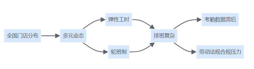 全国门店分布下多元业态和复杂用工模式导致考勤管理挑战