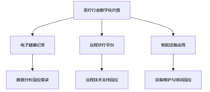 医疗行业数字化升级示意图,展示电子健康记录、远程诊疗及智能设备应用对人才岗位需求的影响。