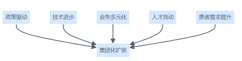 医疗集团发展环境影响因素结构图,展现政策、技术、业务、人才、患者需求对集团扩张的驱动关系。
