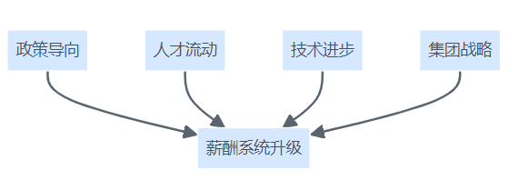 集团化薪酬系统变革驱动力分布结构图,突出政策、人才、技术、集团战略对系统升级的影响路径。