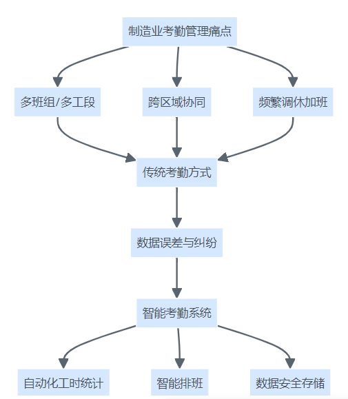 制造业考勤痛点与智能考勤系统升级路径结构图