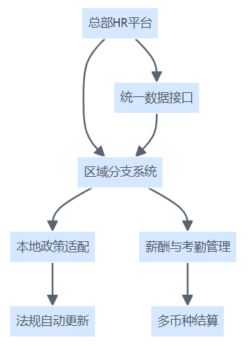 服务行业HR系统全球一体化与本地化兼容的技术结构图,展示总部平台与区域分支、本地政策适配的连接方式。