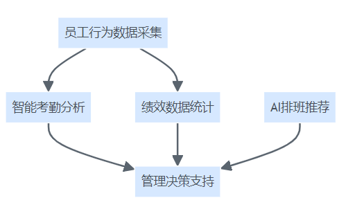 服务行业HR系统智能化流程结构图,展示员工数据采集、智能分析、AI排班与管理决策的联动。