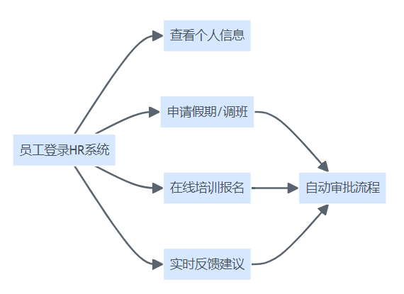 服务行业HR系统员工自助服务流程图,展示员工自助操作至自动审批的关键流程。