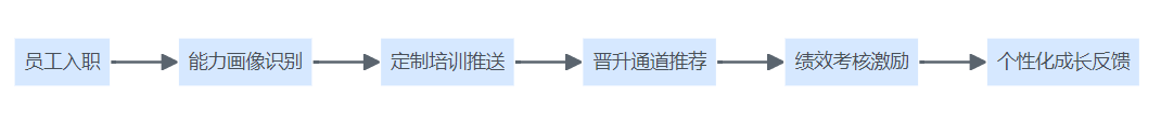 服务行业HR系统个性化人才管理流程图,展示从入职到晋升、激励与成长反馈的全流程。