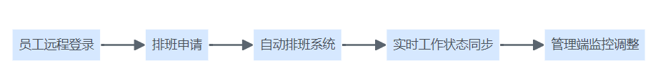 服务行业HR系统支持灵活用工与远程管理流程图,展示员工远程登录、排班自动化、状态同步与管理端监控的完整流程。