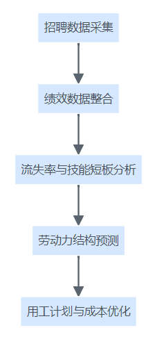 一体化平台支持劳动力规划的数据分析流程,包括招聘、绩效、流失率分析及用工优化。