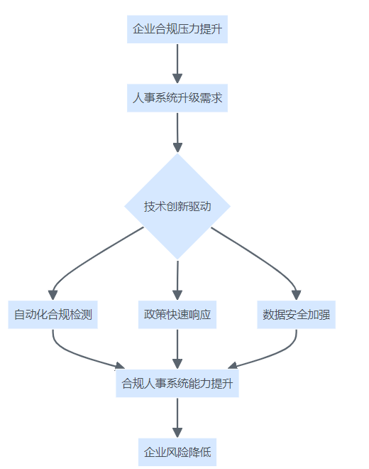 结构图展示企业合规压力推动人事系统技术升级,实现自动化检测、政策响应和数据安全,最终提升合规能力与降低风险。