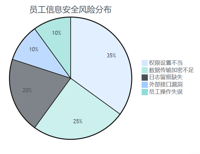 饼图展示企业人事系统员工信息安全风险分布,突出权限设置、数据加密和日志管理等关键风险点。