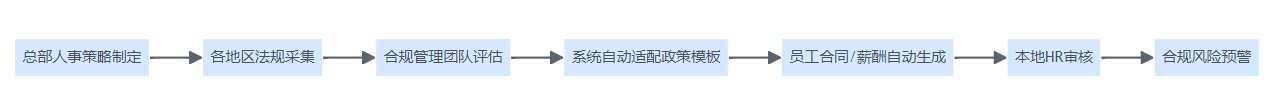 流程图展示企业全球化合规人事系统的本地化适配流程,从总部策略到本地政策自动匹配及风险预警。