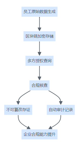 结构图展示区块链在合规人事数据管理中的流程,包括数据加密、授权查询、合规核查和自动审计,全流程保障数据可信与合规。