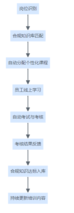 流程图展示个性化合规培训在企业人事系统中的自动化流程,从岗位识别到课程分配、考试考核及知识库更新,形成闭环管理。