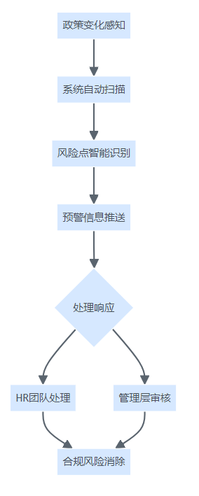 流程图展示企业合规人事系统实时监控与预警机制,从政策感知、风险识别到多级响应和风险消除的全流程。