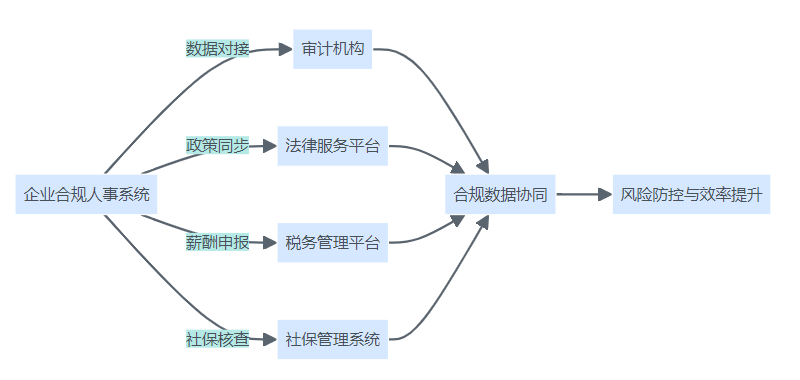 结构图展示企业合规人事系统与外部生态(审计、法律、税务、社保)多平台协同的数据流转与风险防控机制。