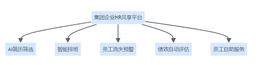 集团企业HR共享平台智能化功能结构图,展示AI简历筛选、智能排班、流失预警、绩效自动评估、员工自助服务五大模块链接。