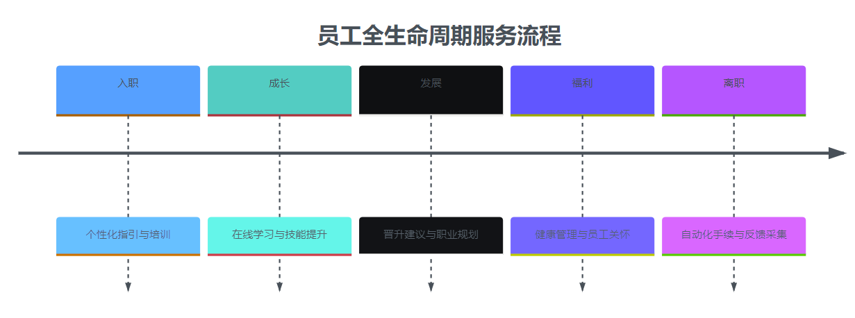 员工全生命周期服务流程时间线,展示入职、成长、发展、福利、离职五个关键节点对应的服务内容。