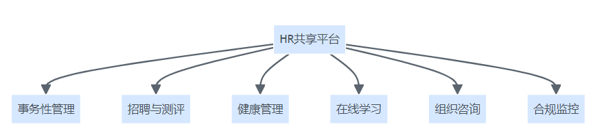 HR共享平台服务拓展结构图,展示平台在事务性管理、招聘测评、健康管理、在线学习、组织咨询、合规监控六大方向的延伸。