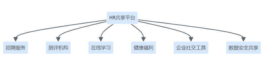 HR共享平台生态化结构图,展示平台与招聘服务、测评机构、在线学习、健康福利、企业社交工具和数据安全共享六大模块的连接关系。