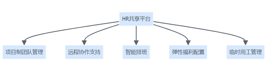 HR共享平台敏捷组织与灵活工作支持结构图,展示平台在项目管理、远程协作、智能排班、弹性福利、临时用工五个场景的应用。