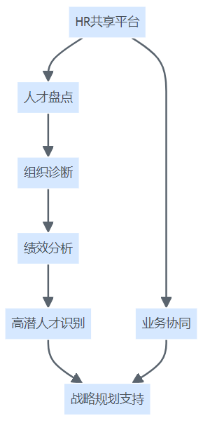 HR共享平台战略伙伴功能结构图,展示平台在人才盘点、组织诊断、绩效分析、高潜人才识别、战略支持、业务协同等六方面的作用。