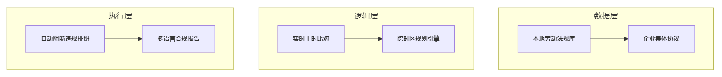 欧盟工时指令(EWTD)要求连续6日工作必须强制休息,某出海企业因时差导致合规监测滞后,累计罚款超200万欧元。解决方案是构建三层合规引擎:
