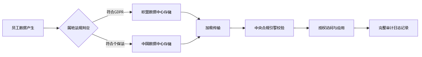 图释:系统需根据员工数据所属地域法规,自动判定存储位置,并在传输、处理、访问全链路进行合规校验与审计。