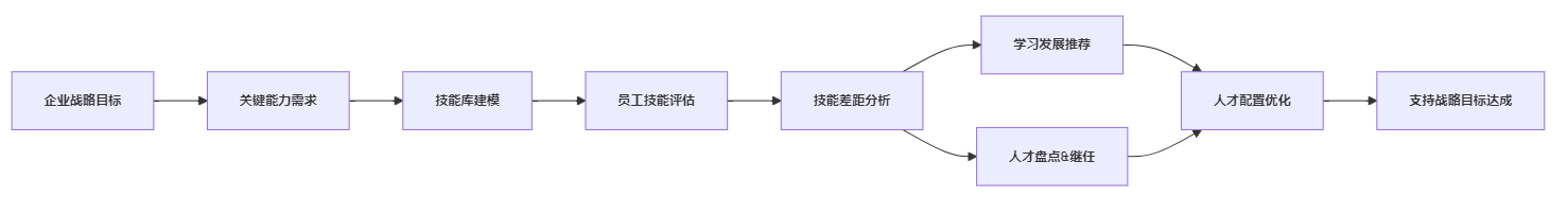 图释:以企业战略所需能力为起点,通过技能建模、评估、分析,驱动学习发展与人才配置,形成闭环。