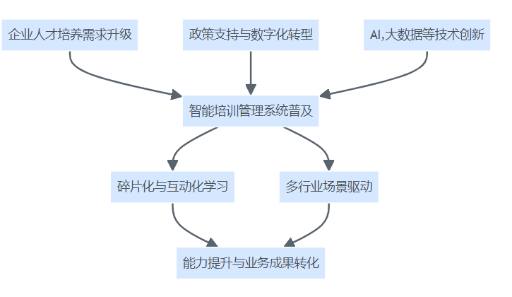 2025年企业教育培训行业发展各要素之间的关联结构图,突出需求升级、政策与技术创新、智能系统普及、学习方式变革与能力提升等核心趋势。