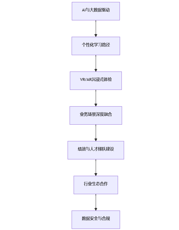 未来智能培训管理平台的演进路径结构图,展示AI驱动、沉浸体验、场景融合、行业合作与数据安全等发展脉络。