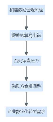 医疗器械企业薪酬管理痛点与需求流程图,体现销售合规风险、核算易错、审查压力及调整难题。