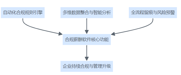 合规薪酬软件技术创新路径示意图,涵盖自动合规规则、多维数据整合与智能分析、全流程留痕与风险预警。