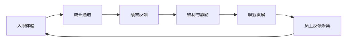 员工体验优化环,展示从入职、成长、绩效、福利到反馈采集的全流程闭环管理。