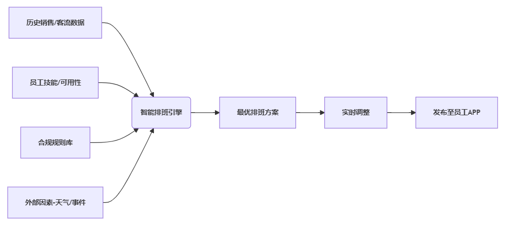 智能排班引擎普及: 基于历史销售数据、客流量预测、天气因素、员工技能与可用性、合规要求(如最小休息间隔)等多维度数据的复杂算法,系统将自动生成最优排班方案。它能瞬间完成人工需要数小时甚至数天才能完成的复杂计算,并实时响应突发变化(如员工临时请假)。某知名快餐连锁在部署此类系统后,不仅将排班耗时减少70%,更通过精准匹配人力需求与客流高峰,显著降低了冗余工时成本。
