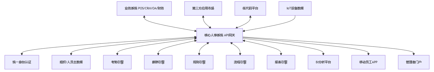 强大的API接口能力: 提供丰富、稳定、安全的API接口,成为连接企业各类IT系统的“人事数据中台”。核心数据(组织、人员、岗位、考勤、薪酬)和能力(身份认证、审批流)能便捷地被业务系统(如门店POS、CRM、OA、财务系统、供应链系统)调用,也能接收来自其他系统的数据(如销售数据用于绩效计算、OA的出差信息用于考勤关联)。