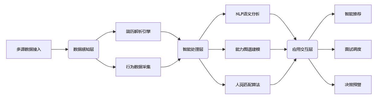 AI智能招聘的本质是建立以人才数据为核心的决策闭环。其技术架构包含三个关键层:数据感知层(多渠道简历/行为数据采集)、智能处理层(NLP解析、能力图谱构建、预测模型)、应用交互层(智能推荐、流程自动化、决策支持)。例如红海eHR系统通过内置的AI引擎,可自动提取招聘网站、内部人才库、社交档案等异构数据,生成动态更新的候选人数字画像。