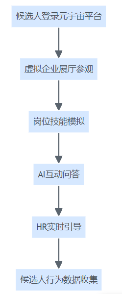 元宇宙招聘流程结构图,展示候选人从登录平台、参观企业、技能模拟到AI互动与数据收集的沉浸式体验链路。