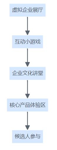 品牌形象塑造流程图,描述候选人从虚拟展厅、互动游戏到企业讲堂和产品体验区的品牌认知旅程。