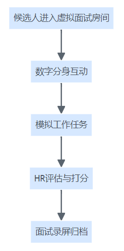 虚拟面试流程图,展示候选人进入面试房间、互动、任务模拟、HR评估及全过程归档。
