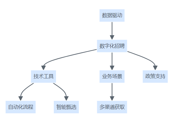 数字化招聘的构成要素结构图,展示技术工具、业务场景、政策支持、数据驱动等核心要素之间的关系。