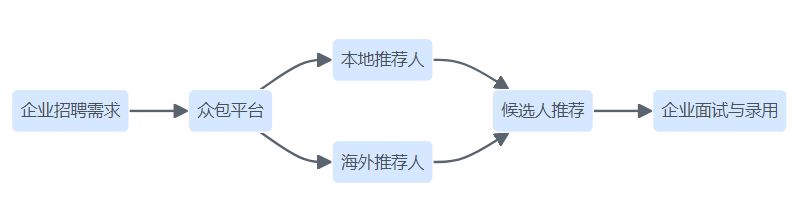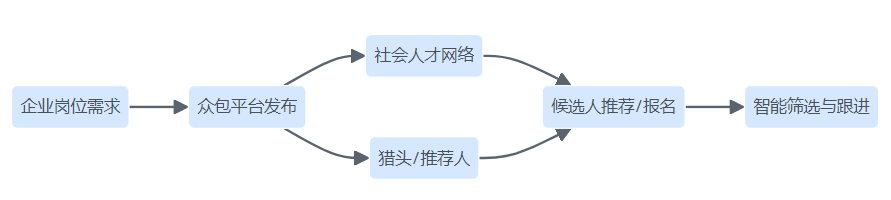 企业通过众包平台将招聘需求发布到社会各方,参与者推荐候选人,系统进行智能筛选和后续跟进。