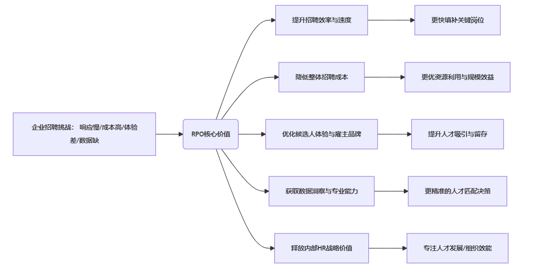 图 1:RPO 价值传导核心路径图 (图示说明:此图清晰展示了企业面临的招聘痛点如何通过RPO模式转化为核心价值,并最终作用于业务结果的关键路径。)