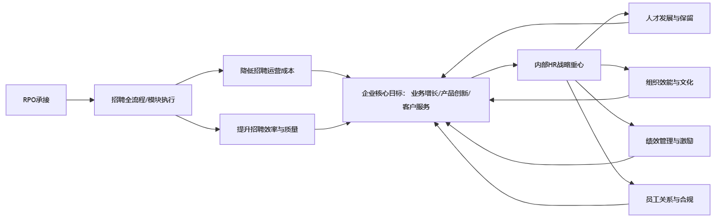 图 4:RPO 赋能企业HR战略聚焦示意图 (图示说明:此图清晰对比了企业引入RPO后,内部HR团队从执行事务中解放,得以聚焦于战略重心;而RPO则高效承接运营工作,共同服务于企业核心目标。)
