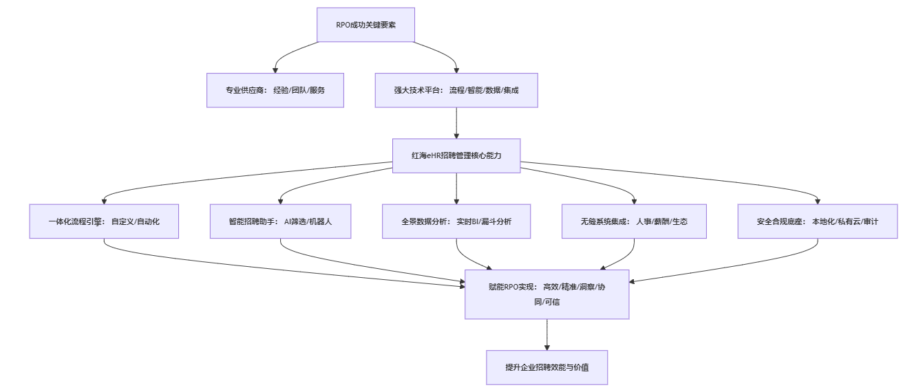 图 5:技术平台(红海eHR)赋能RPO核心价值图 (图示说明:此图总结了RPO成功的两大支柱——专业供应商与强大技术平台,并详细拆解了红海eHR作为核心平台如何通过五大核心能力赋能RPO实现价值,最终提升企业招聘效能。)