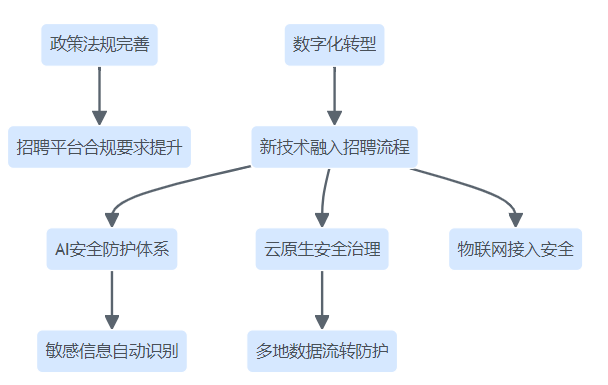 招聘安全技术演进路径结构图,展示从政策法规完善、企业数字化转型到AI、云原生、物联网等技术应用对招聘安全体系的推动。