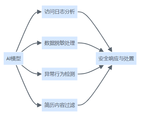 AI赋能招聘安全的多维度防护体系结构图,展示AI在日志分析、数据脱敏、异常检测、简历过滤等环节协同保障招录数据安全。