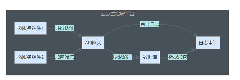 云原生招聘系统安全防护结构图,展示微服务组件、API网关、数据库和日志审计协同构建多层安全防线。